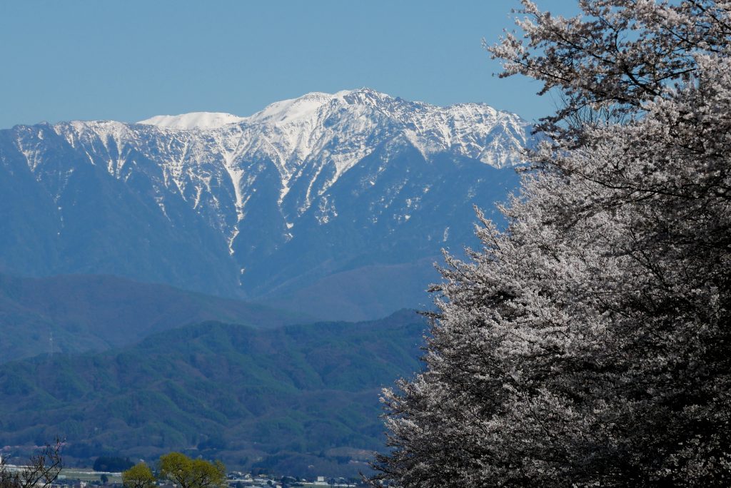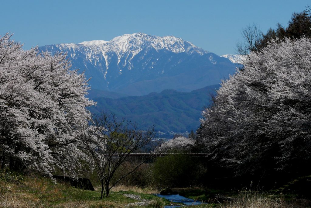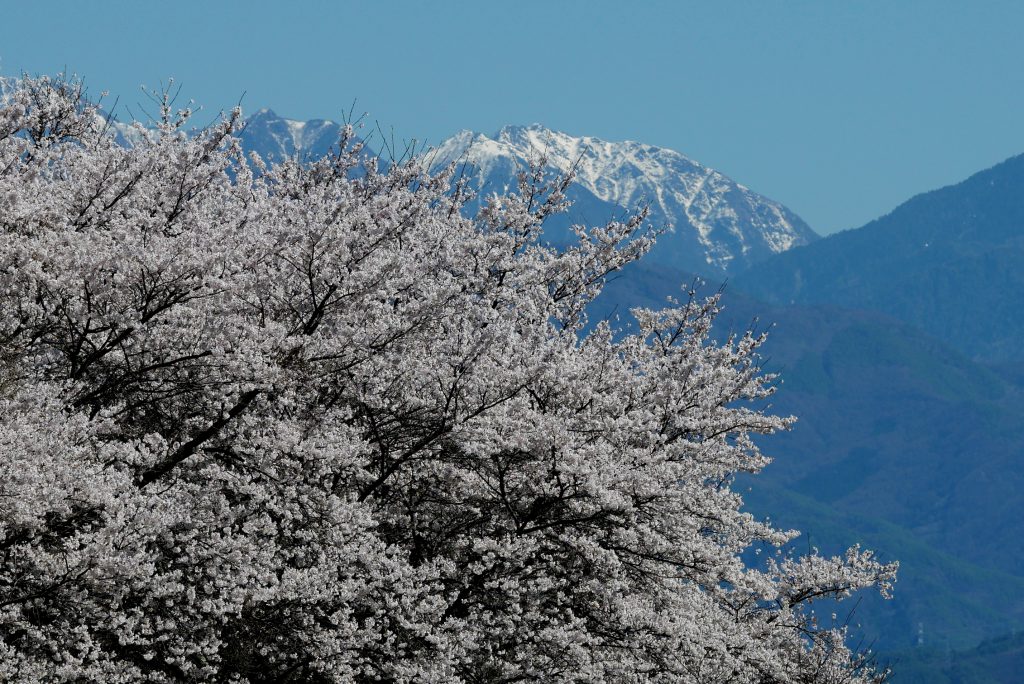 下の写真2- 右岸の桜と仙丈ケ岳のアップ写真です。