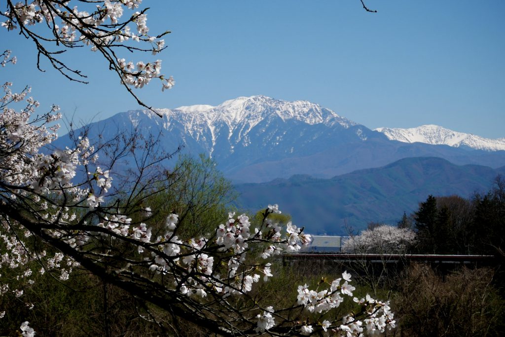 去年の4月16日に同じテーマでブログを載せましたが、山に雲が掛かりいまいちでした。今年は雲もなく一層綺麗な桜と山が見れましたので今年の風景をお届けします。