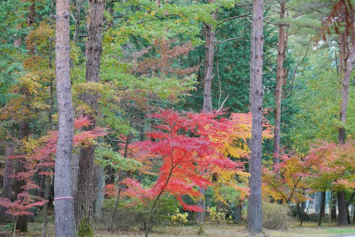 下の写真ー 信州大学農学部付近の林の紅葉です。緑、黄、赤の対比が綺麗です。